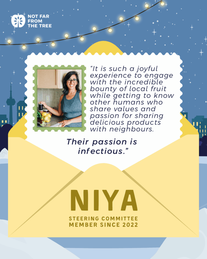 Niya first connected with Not Far From The Tree through an event for community organizations where she was sharing her expertise in fundraising and donor engagement. As the founder of the Food Security Giving Circle at the Toronto Foundation, she was already deeply immersed in the city’s philanthropic landscape. After meeting with our Program Director and learning more about the organization’s roots, Niya realized the mission mirrored her own professional and personal dedication to food justice, leading her to join the Steering Committee.
