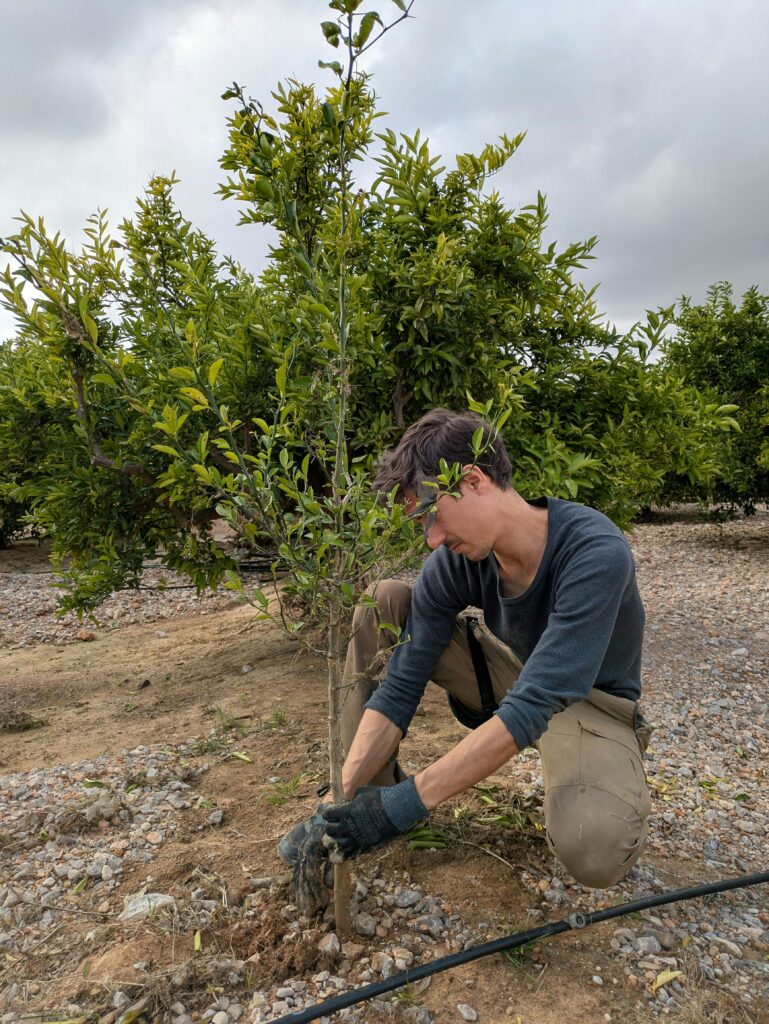 When planting a fruit tree, you want the hole to be twice the size of its root ball – but not too deep! A good measurement is to look at the base of the tree and make sure that is as far as the soil goes.