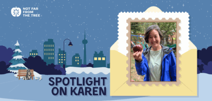 Karen first got involved with Not Far From The Tree in 2022 after an apple pick at Spadina House, an experience that quickly uncovered a perfect mix of her favourite things: fruit picking, foraging, climbing trees, and spending time outdoors.