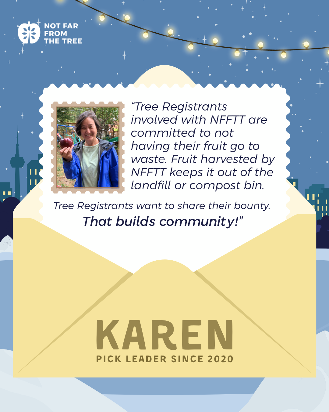 This winter, as we celebrate another record-breaking harvest, we’re shining a light on the people who bring Not Far From The Tree to life. Meet Karen: a Pick Leader whose curiosity about local fruit turned into a commitment to reducing waste, feeding neighbours, and helping the community flourish.